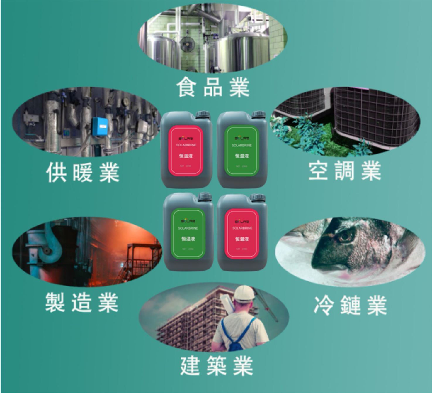 - SolarBrine恒温液可应用于伺服器冷却、储能设备、冰水主机、啤酒工厂、热电池管理、空调系统、充电桩、地暖、太阳能管路、冷链系统、电脑主机房散热、5G基地台、高铁车头、风电、印刷厂、电子半导体业、建筑业和其它特殊行业等领域之冷热循环系统,作为温度调节使用。
