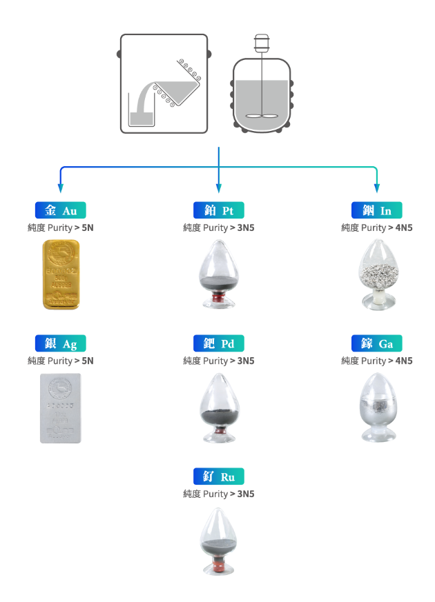 具有火法、湿法以及高/低品味废料回收技术,能将回收材料从提纯精炼至4N~6N以上电子级/工业级的原料纯度。秉持绿色全循环理念,能回收处理固体、液体等多元废料源,建立五种贵金属金、银、铂、钯、钌和三种稀有金属铟、镓、钽等八大贵稀金属回收精炼平台。