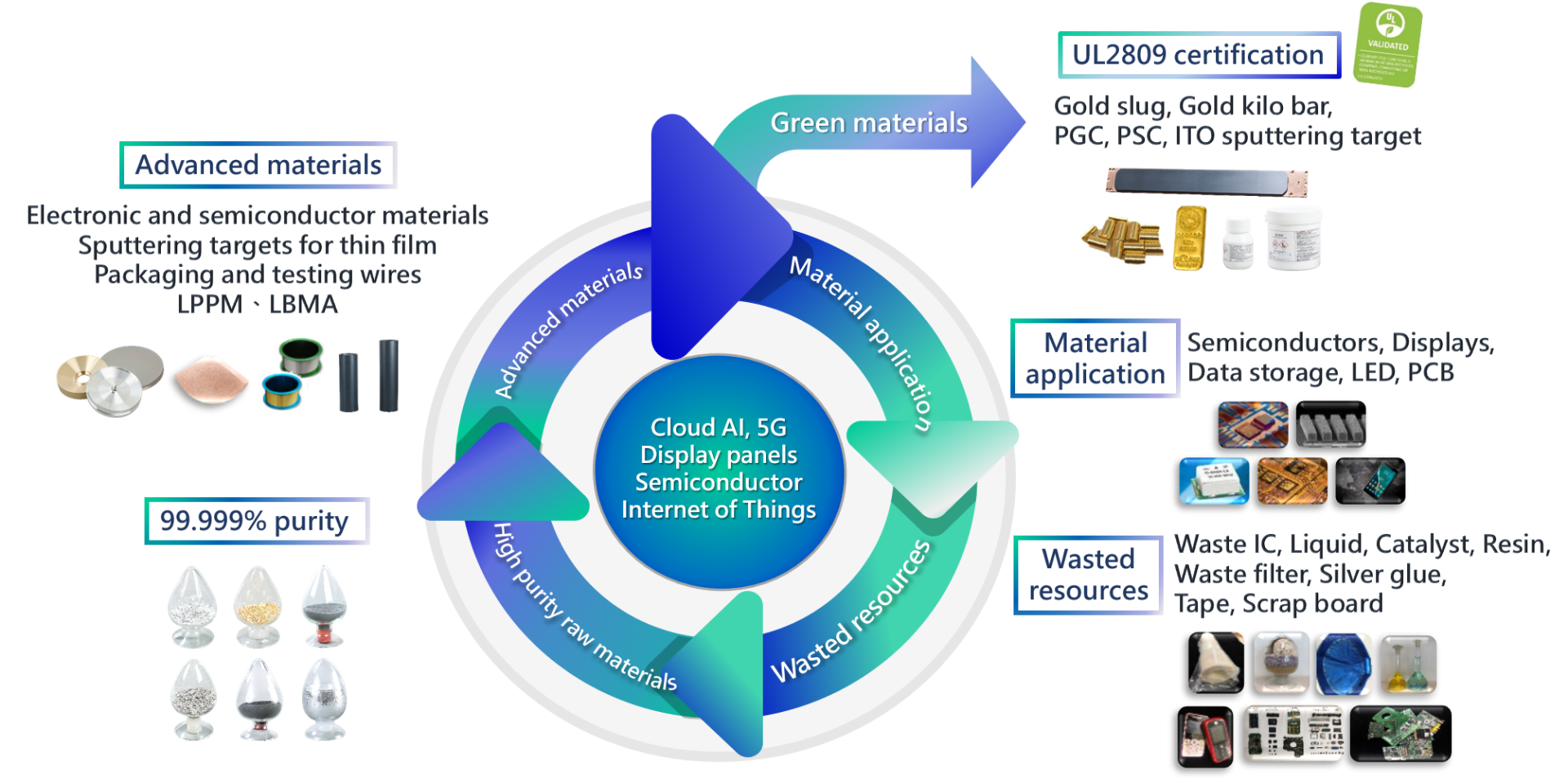 SOLAR recycles the industrial scraps of precious and rare metals , and purifies them into industrial-grade raw materials through the developed refining and purification technologiesy developed inhouse. These refined materials are directly made into various industrial products for use by domestic and global clients, thus implementing the circular economy model of transforming scraps into high-end materials.