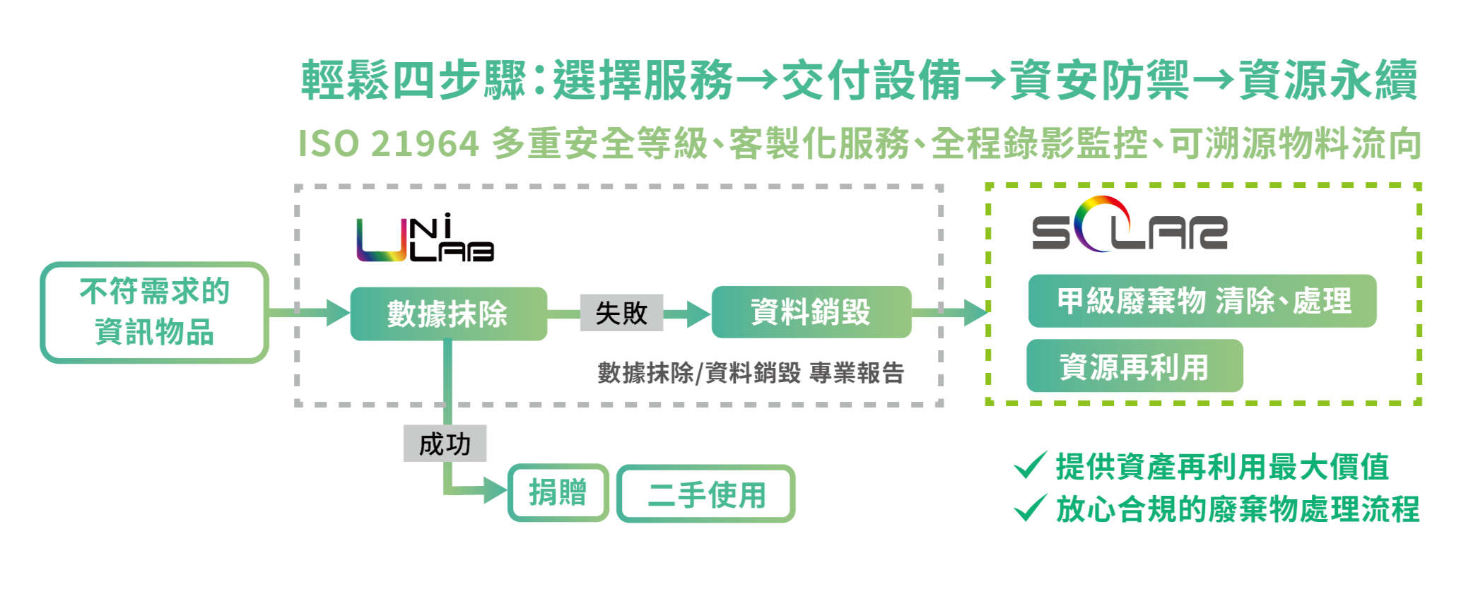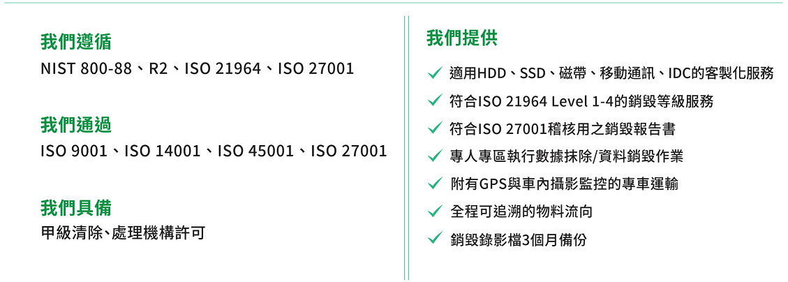 依循國際資訊安全規範,如:NIST 800-88、ISO 21964、ISO 27001等,提供「軟體數據抹除」、「硬體物理銷毀」、「廢棄物處理」、「資源回收」一站式資料銷毀,服務完整溯源;有效防護資訊安全、延長電子產品使用年限,量化數據抹除/資料銷毀ESG效益,實踐資源永續循環。