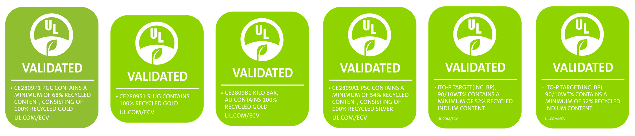 - 而含有稀有金屬銦(Indium)的ITO濺鍍靶材,透過 UL 2809 驗證,確保產品中的再生銦原料可達52%。